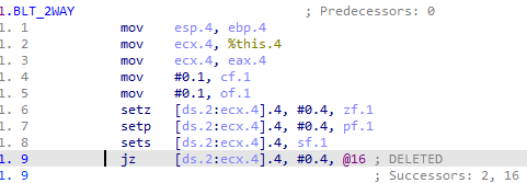The microcode viewer has more interactivity: now it is possible to delete undesirable instructions during decompilation or add new instructions. For example, the instruction 1.9 was deleted by the user right clicking on an instruction and selecting “Delete instruction”: