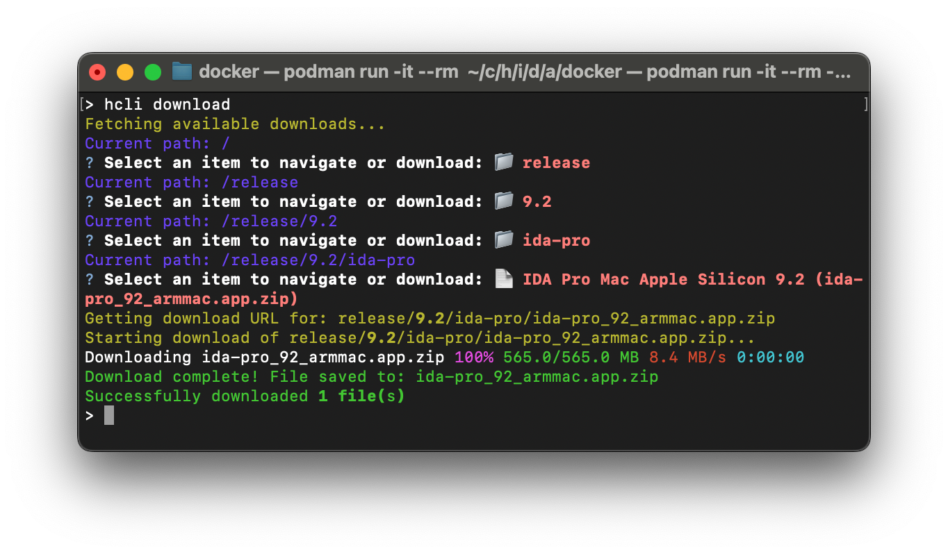 HCLI presents a textual interface where you navigate through folders using arrow keys. Choose "release" → "9.2" → "ida-pro" → and select your platform. HCLI downloads it and shows you progress bars. Of course, if you know the resource you want, you can provide this as a CLI argument.
