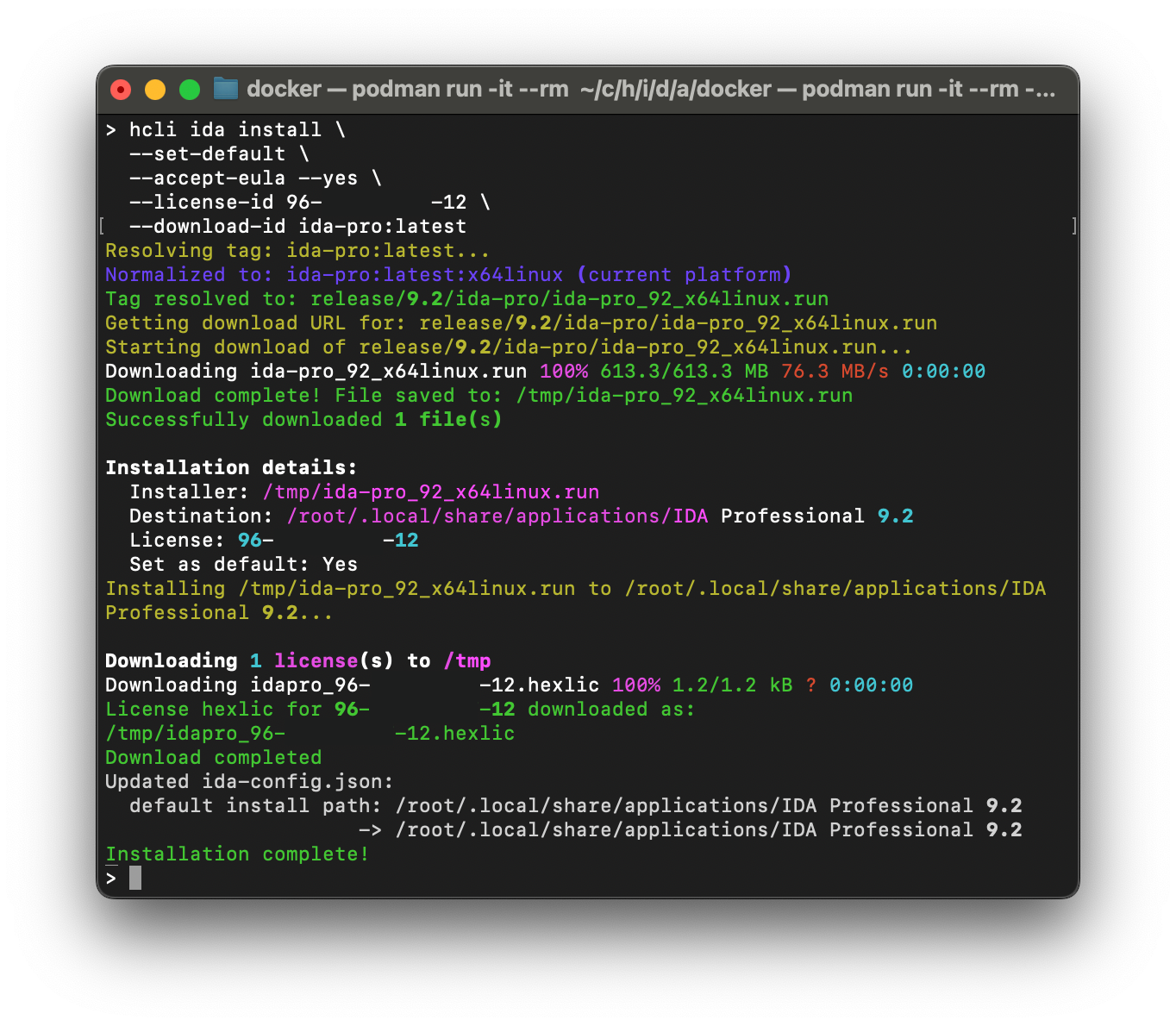 No GUI dialogs. No clicking "Next" eight times. HCLI downloads the installer (if you didn't already), extracts it, installs it to a standard location, fetches your license file, installs the license, and marks this as your default IDA installation.