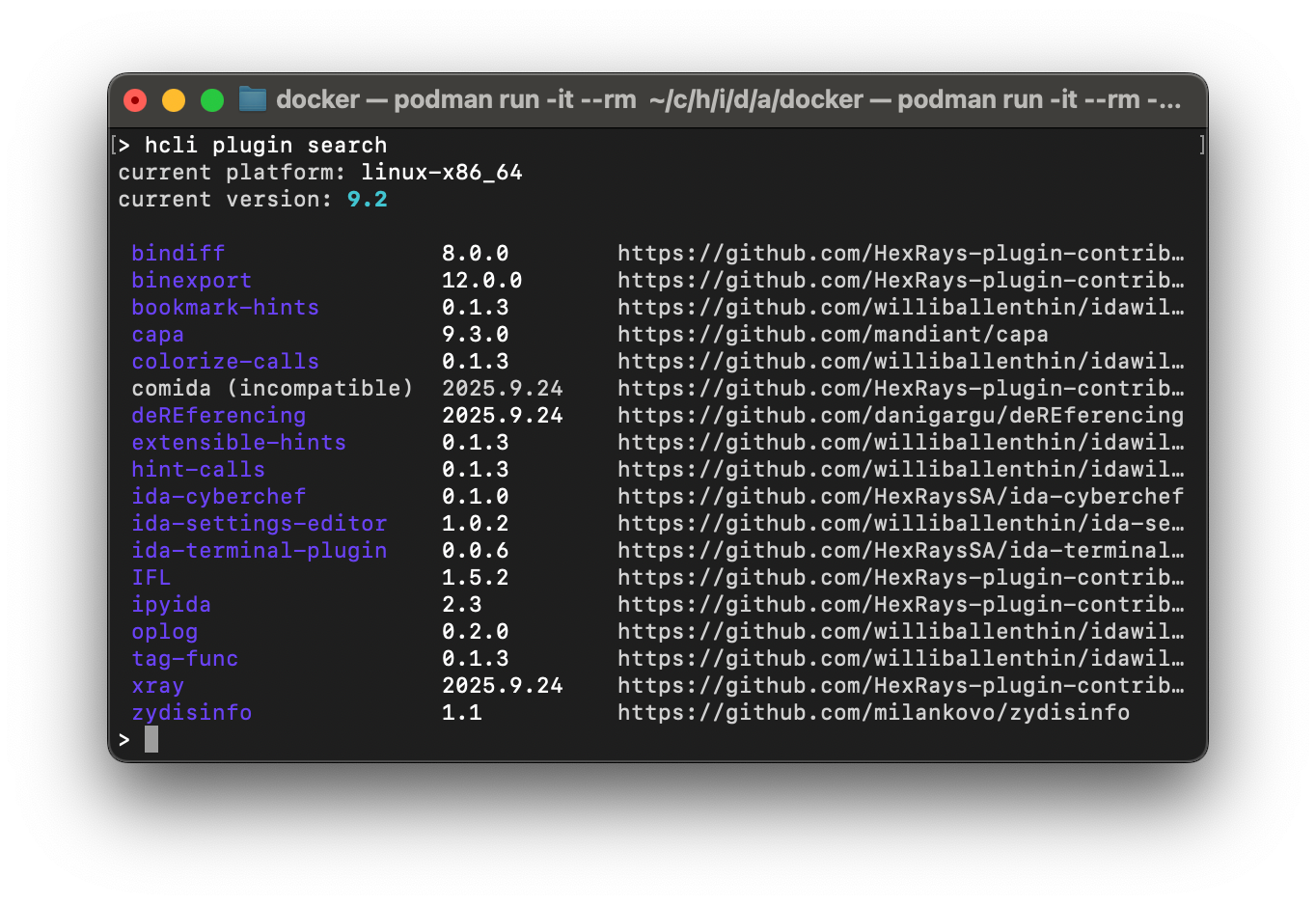 HCLI shows you every plugin in the central repository, indicating which ones are already installed, which have available upgrades, and which are compatible with your IDA version.