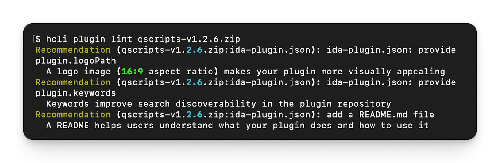 The linter catches common problems: missing required fields, JSON syntax errors, incorrect entry points, invalid dependency names, and more. Fix any issues before releasing. The indexer won't add invalid plugins to the repository, so the first step to triaging a missing plugin is to ensure there are no lint failures.