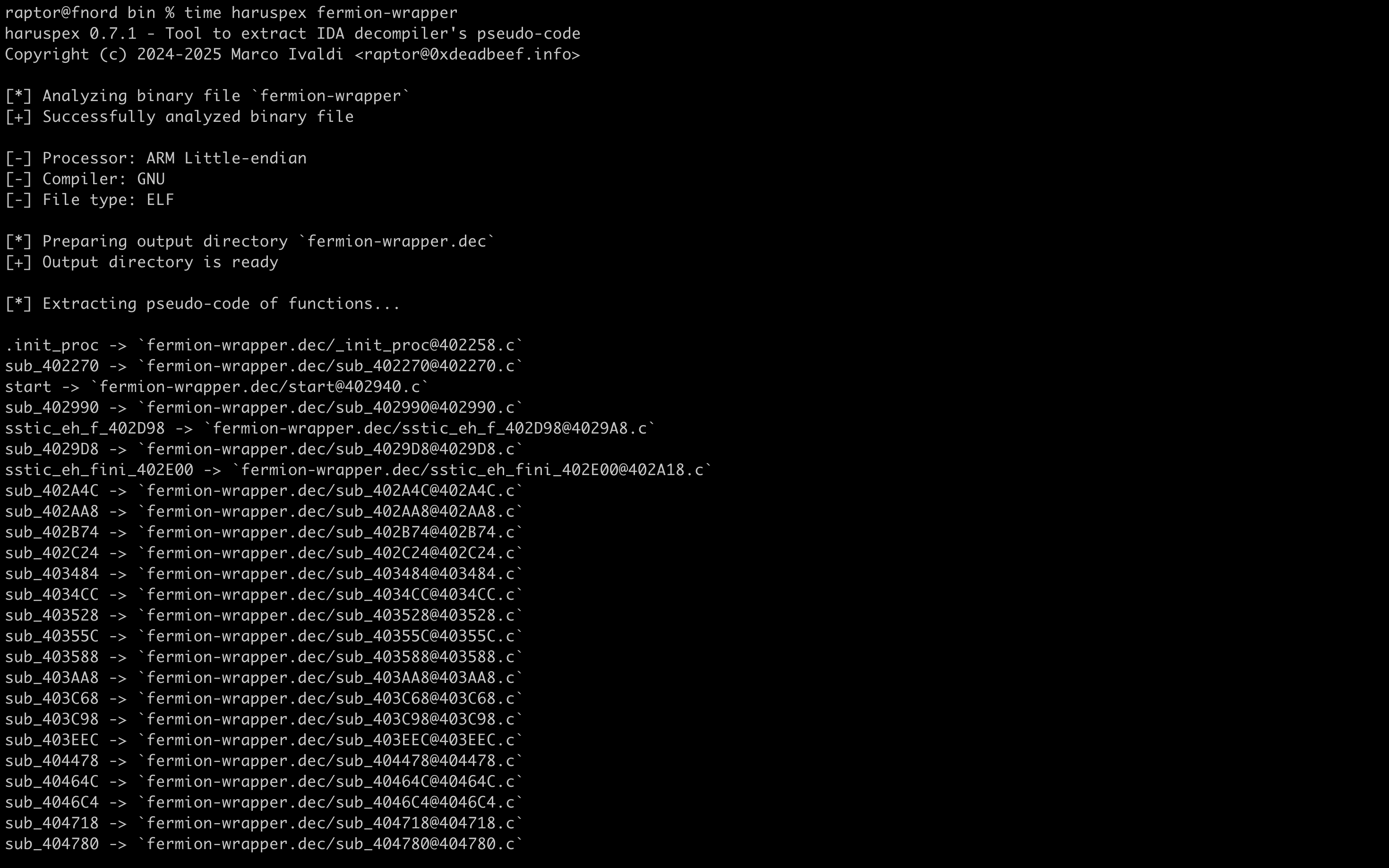 Installation and usage are akin to what I have described earlier for rhabdomancer. The most notable difference is that haruspex can also be used as a library by third-party crates to decompile specific functions and save pseudocode to disk. An example of this is augur, another IDA Pro headless plugin I wrote that extracts strings and related pseudocode from a binary file. I encourage you to check it out.