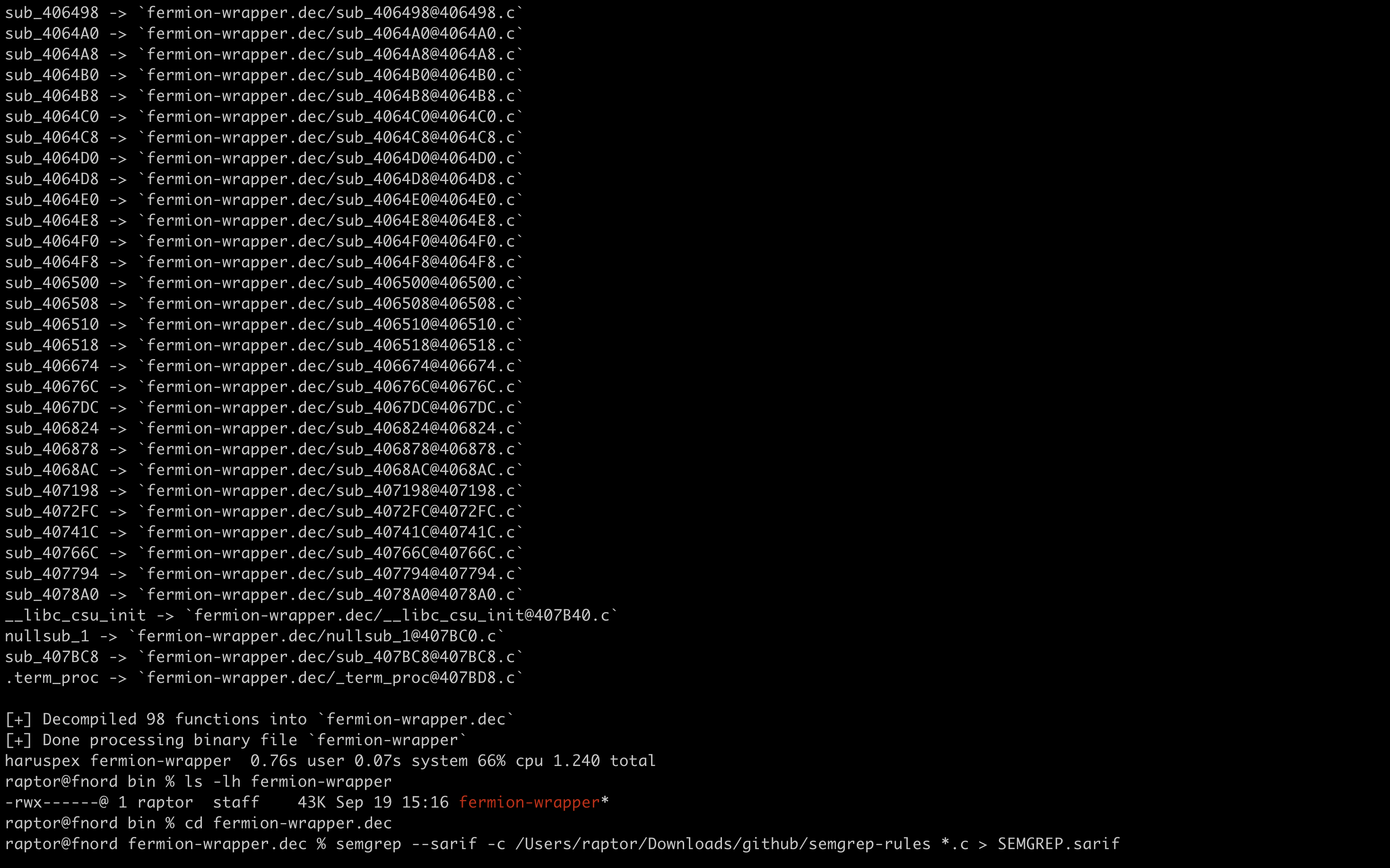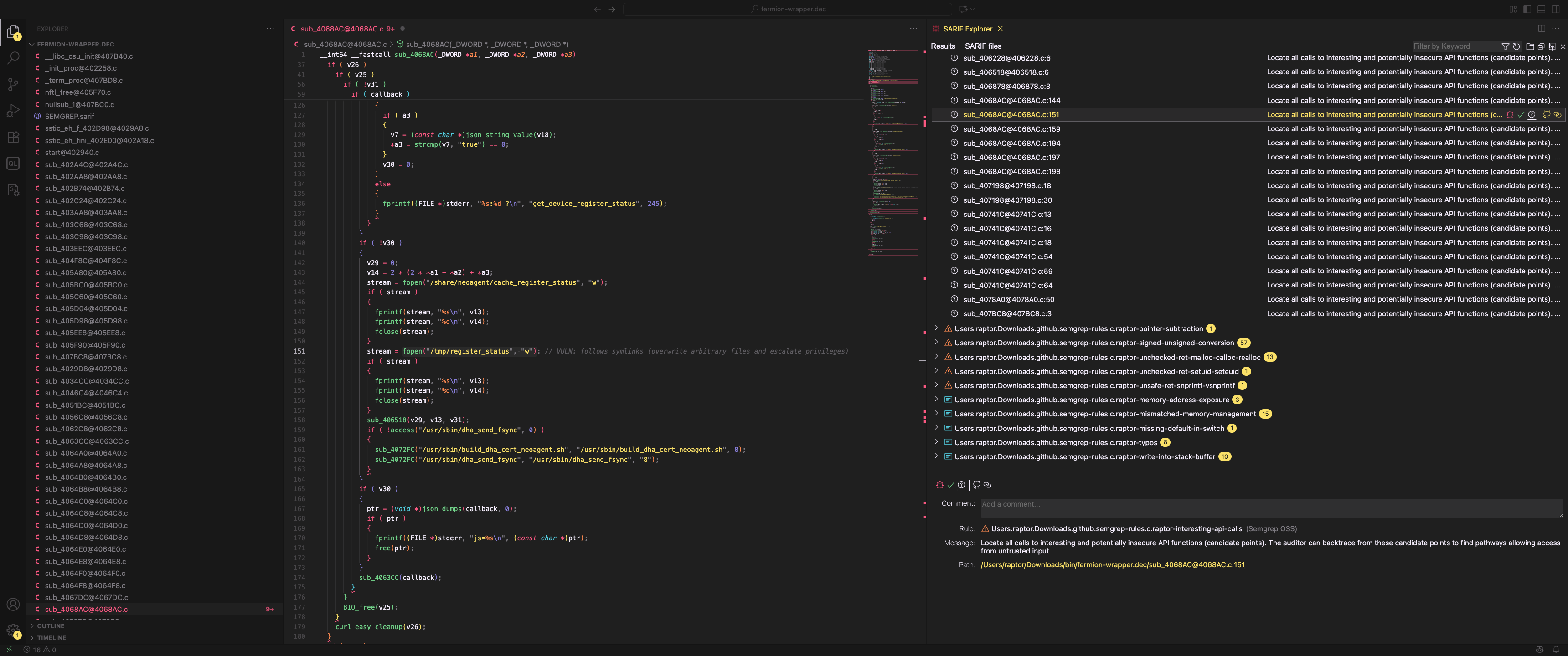Enjoy decompiled pseudocode and Semgrep scan results conveniently loaded in your favorite IDE, courtesy of the SARIF Explorer extension for VS code.